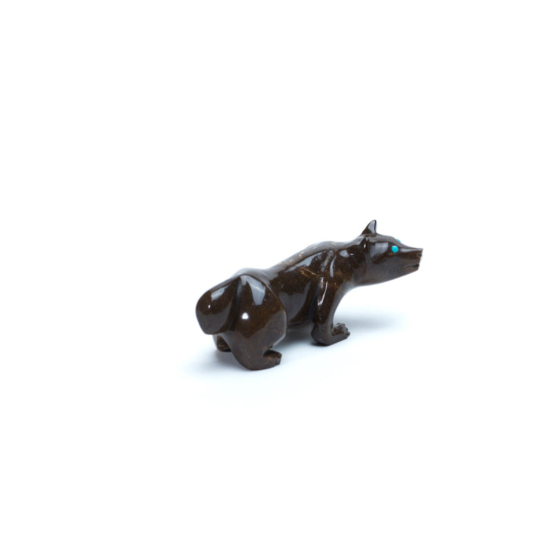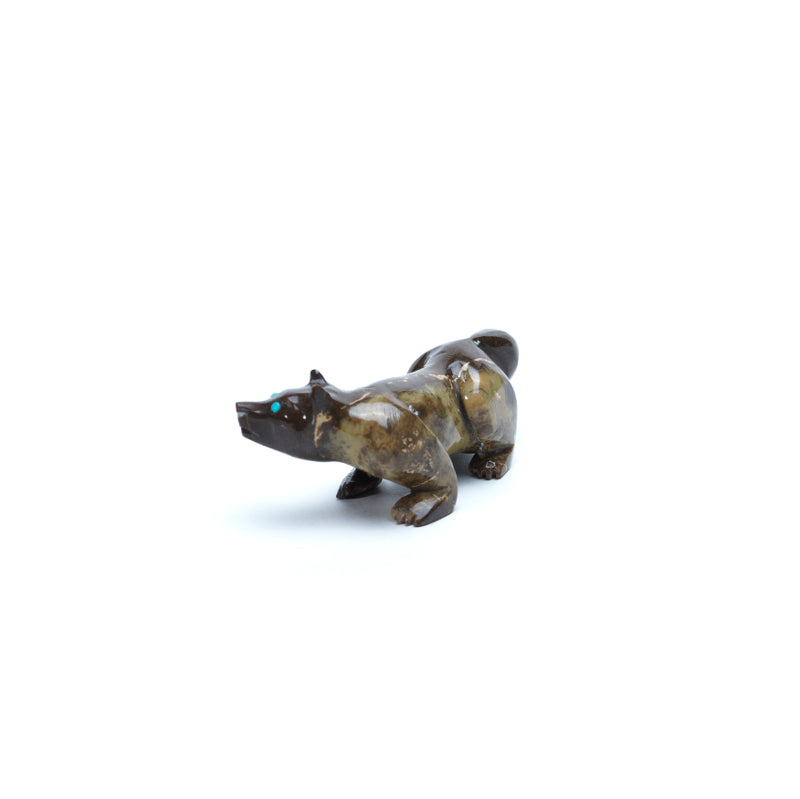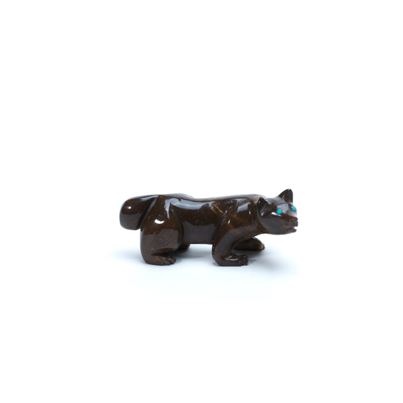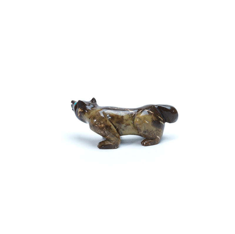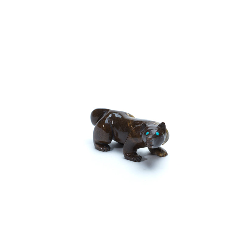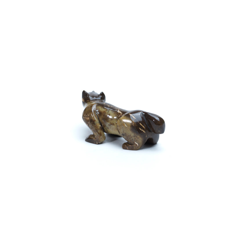 Carved from travertine, a sedimentary stone with warm, earthy brown tones that echo the rugged terrain of the Southwest. Its natural texture adds depth and realism to the carving. The brown earth tones of the travertine give the piece a grounded, primal feel—perfect for a wolverine, which symbolizes ferocity, independence, and resilience.