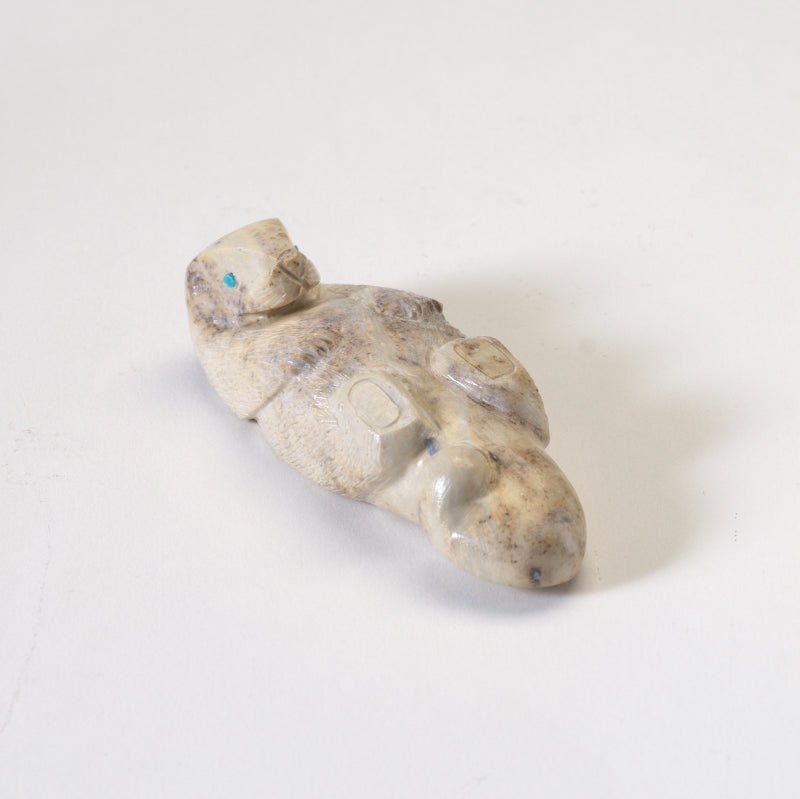 This exquisite carving captures the essence of the playful creature at rest, perfectly balanced on a suspended moment in time. The detailed craftsmanship of the fishrock intricately carved to form the sleek body of the otter is truly awe-inspiring. And those piercing turquoise eyes seem to hold a depth of emotion and intelligence that draws you in, captivating your imagination. As you gaze upon this dramatic piece, you can almost feel the gentle ripple of water beneath the otter's back and hear the soft sounds of nature all around. It is a stunning representation of beauty and grace in its most natural form.