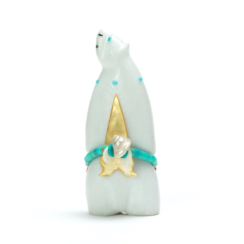 A magnificent standing bear carved out of smooth white marble, with its piercing turquoise eyes stealing the show. This elegant carving effortlessly captures the sheer power and majestic beauty of this awe-inspiring mammal. Michael has paid meticulous attention to detail, skillfully carving the bear's strong muscles into the marble, creating a sense of lifelikeness that is truly incredible. The choice of white marble lends an air of purity and serenity to the piece, enhancing its overall aesthetic appeal. However, it is those captivating turquoise eyes that truly breathe life into the carving. They glimmer with an otherworldly brilliance, capturing your gaze and seemingly inviting you into their world.
