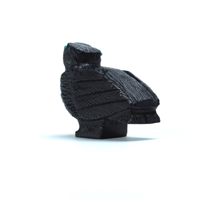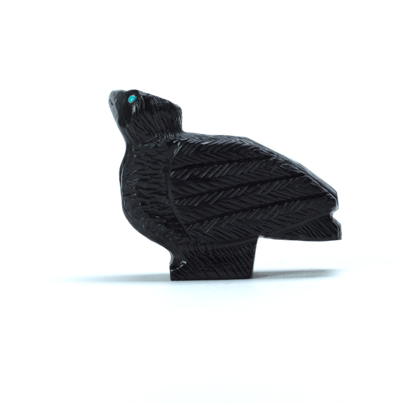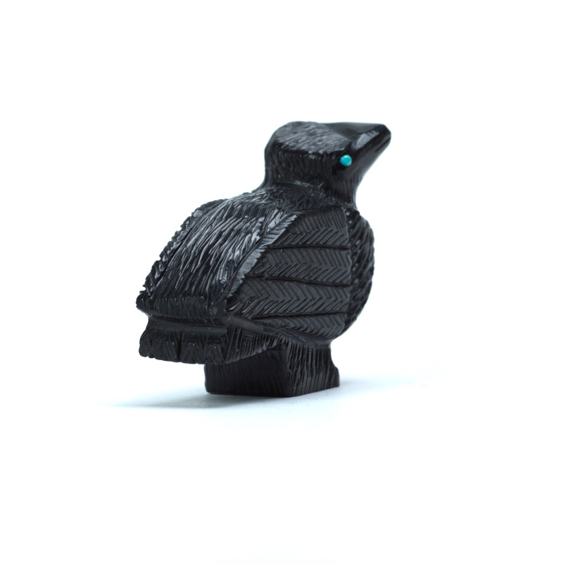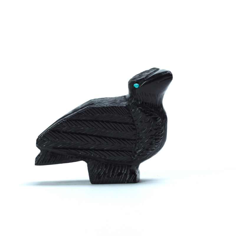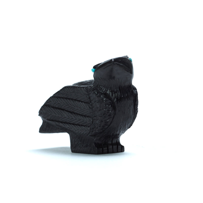 I am absolutely thrilled to share with you this exquisitely crafted piece of art! The smooth, glossy surface of the jet captures the light in such a way that it seems to glow from within, accentuating the intricate details meticulously worked into its form. Each feather is delicately etched, as if frozen in time, creating a sense of motion and life in this stunning carving. And those piercing turquoise eyes! They seem to stare straight into your soul, full of mystery and intelligence. This raven is not simply an object; it is a masterpiece that evokes awe and wonder, inviting you to explore its beauty and symbolism for hours on end. Truly a magnificent work of art that will captivate all who lay eyes upon it.
