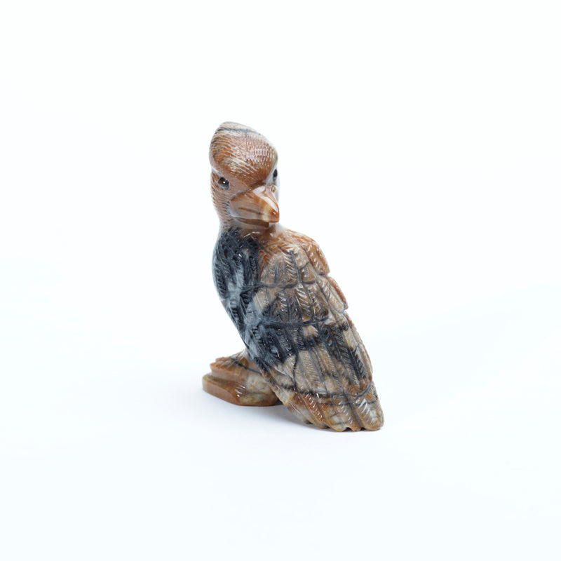 The natural swirls and streaks of warm browns, soft greys, and subtle blacks in the marble create a textured, flowing pattern across the body, suggesting the delicate layering of feathers. Set into the face are deep black eyes, their rich hue contrasting beautifully with the earthy tones of the marble and giving the bird a vibrant, watchful presence. The combination of the dynamic marble patterns and the striking garnet eyes results in a carving that is both elegant and lively, radiating natural beauty and quiet intensity.