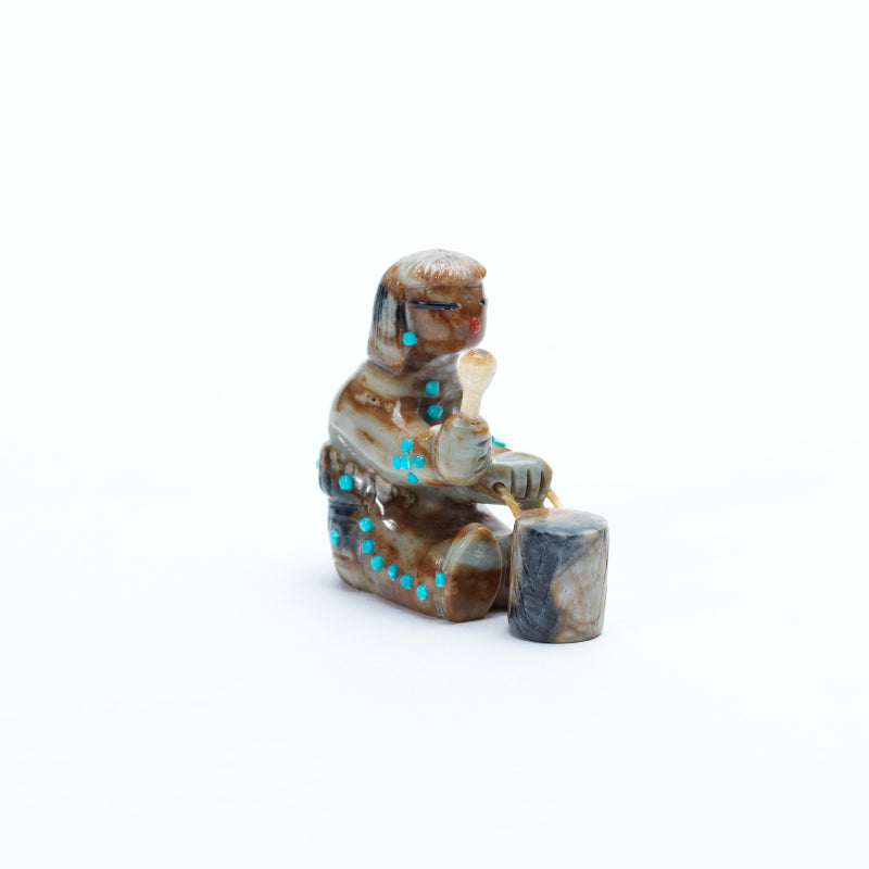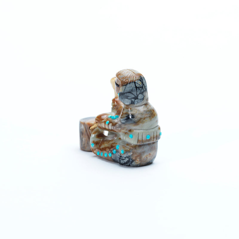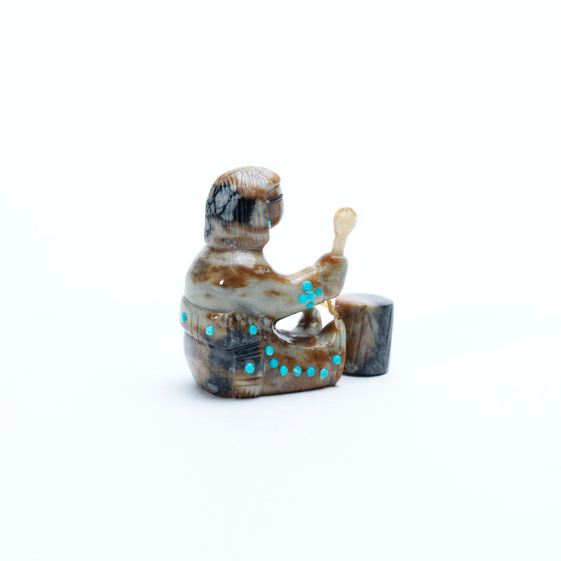 A sitting drummer carved from Picasso marble exudes energy and presence, the polished stone highlighting the swirling patterns of earthy tones across the figure’s body. The drummer’s pants and shirt cuffs are accented with inlaid turquoise dots, adding vibrant pops of blue that contrast beautifully with the muted marble. Turquoise earrings further enhance the figure, drawing attention to the head and adding a touch of decorative elegance. The face is detailed with black eyes and a small coral inlay for the mouth, giving the drummer a lively, expressive character. The combination of the natural veining of Picasso marble with the bright turquoise and coral accents creates a piece that is both dynamic and rich in detail, capturing both movement and personality in the carving.