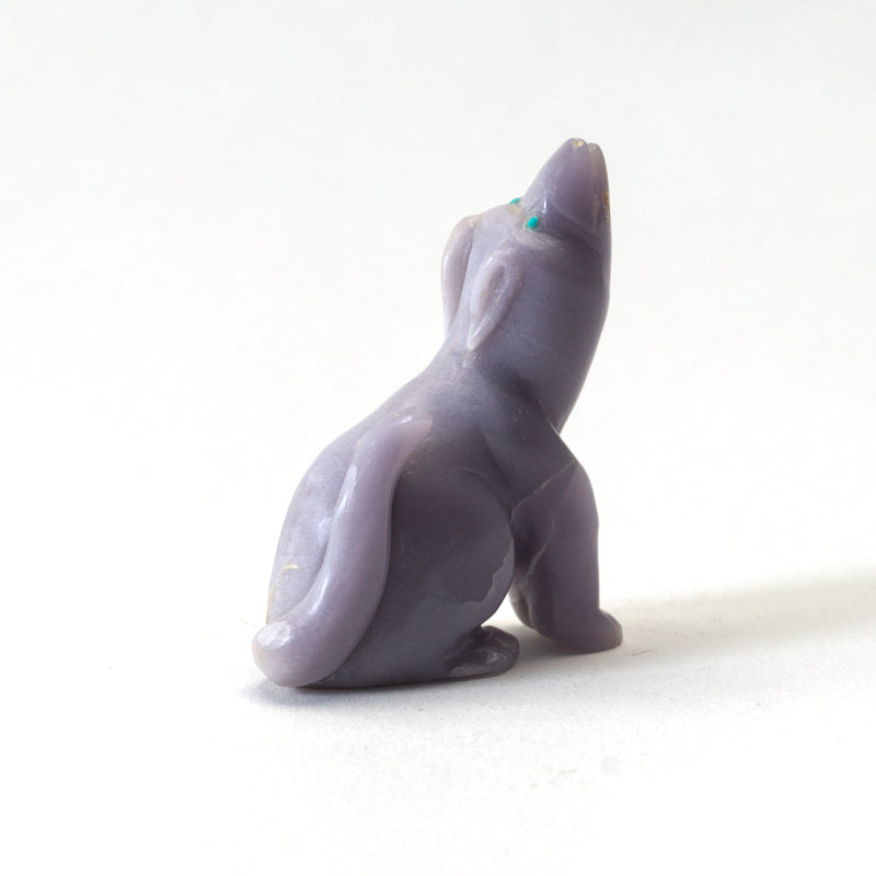 The choice of material, young fluorite, lends a unique and vibrant color to the carving, while the addition of the turquoise eyes infuses a sense of life and energy into the piece. This carving is not just an object but a work of art that captures the essence and spirit of a canine companion in a way that is both captivating and awe-inspiring. It serves as a testament to the power of artistry and creativity to transform simple materials into something truly extraordinary.