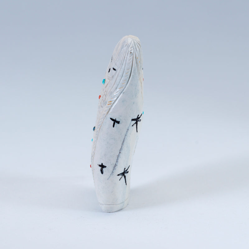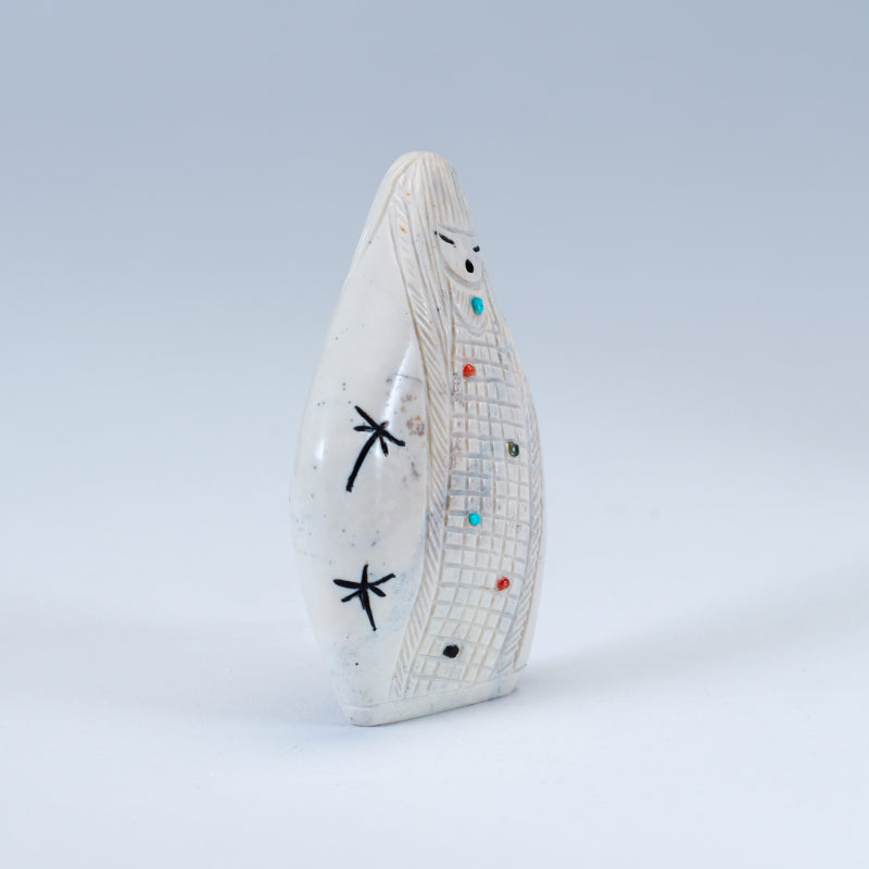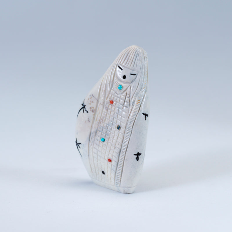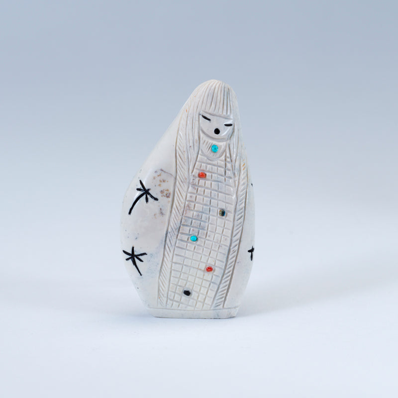 Usually the maiden fetish will be emerging from corn (the corn maiden) or she will have whorls of hair on the side of her head, signifying that she has not had a child. The mother fetish also can be emerging from the corn (the corn mother) and she will have children with her or look pregnant. The grandmother usually has a shawl over her head and no corn represented on her body.