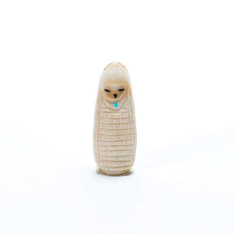 The polished ivory glows softly, its warm, pale tones accentuating the delicate curves of her flowing form and the gentle lines of her attire. Each face is set with small black eyes that give the maiden a watchful, serene expression, adding depth and presence to the carving. On her chest, a single inlaid turquoise dot gleams vividly against the ivory on one side and coral on the other, serving as a symbolic focal point of spirit or vitality. The combination of the ivory’s luminous elegance, the striking turquoise, and the subtle contrast of the black eyes creates a piece that feels timeless, refined, and imbued with quiet strength.