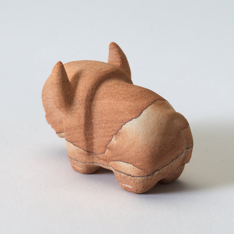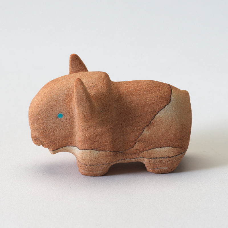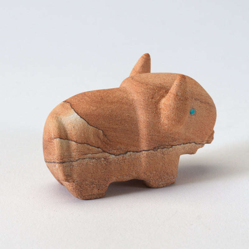 Each curve and contour of its form tells a story of resilience and survival in the harsh landscape it calls home. The vibrant turquoise eyes glint with an otherworldly glow, imbuing the carving with an aura of mystique and ancient wisdom. As you gaze upon this stunning work of art, you can almost hear the distant echoes of thundering hooves across the vast plains, reminding you of the enduring spirit of these powerful beasts. Truly, this buffalo carved of sandstone is a testament to nature's awe-inspiring beauty and untamed power.
