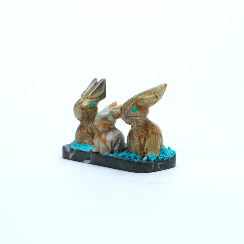Three rabbits carved from picasso marble, their natural swirling patterns of warm browns and grays adding depth and texture to each carving Each rabbit has bright turquoise eyes, creating a lively contrast against the earthy tones of the marble. The trio sits side by side on a shared base, evoking a sense of companionship and harmony. The smooth, rounded forms and subtle detailing highlight both the playful character of the rabbits and the skilled craftsmanship, while the combination of Picasso marble and turquoise brings a striking balance of natural elegance and vibrant color.