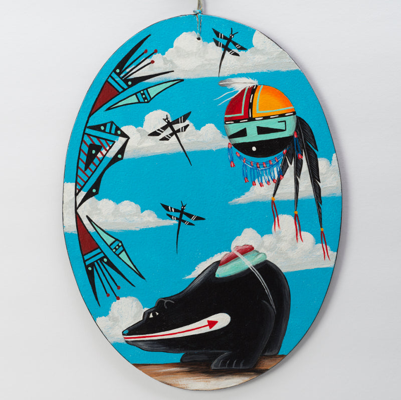 The traditional bear, symbolizing strength, courage, and protection, is painted using vibrant acrylic colors, bringing it to life on the wooden surface. Aside the bear, the Sunface represents warmth, growth, and prosperity. Steve's attention to detail in every brushstroke, resulted in a visually stunning composition that captures the essence of Zuni mythology and beliefs.