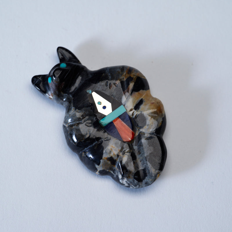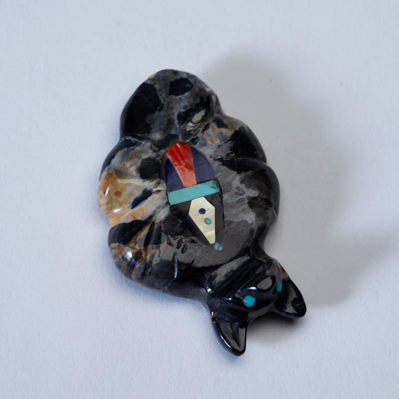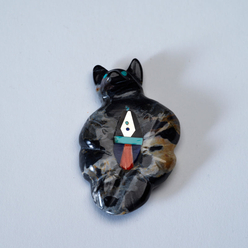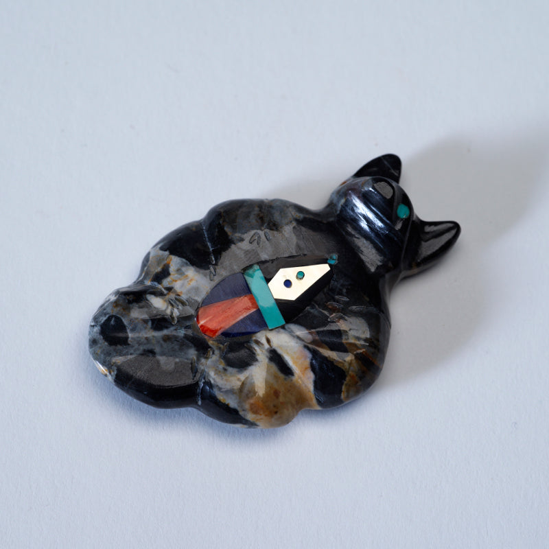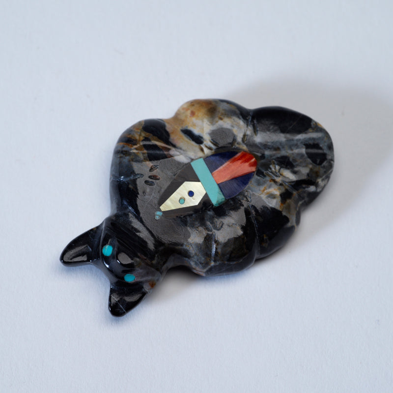 The turquoise eyes glisten with an otherworldly beauty, drawing in viewers with their mesmerizing gaze. And the multiple stone inlays on its chest only add to the overall magnificence of the carving each stone carefully chosen for its color and symbolism. This masterpiece exudes a sense of mystique and power, commanding attention and admiration from all who behold it.