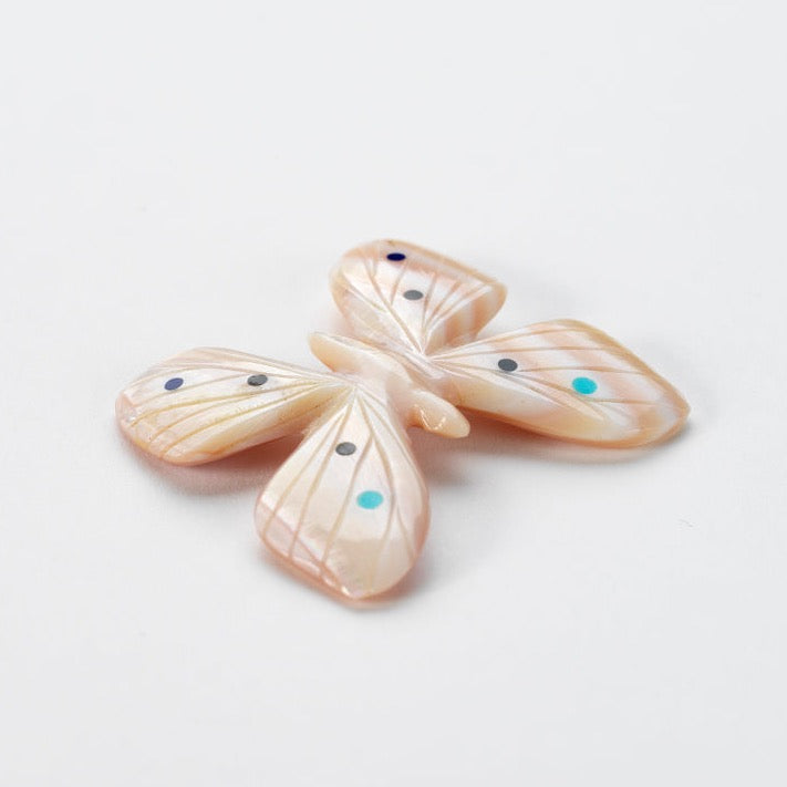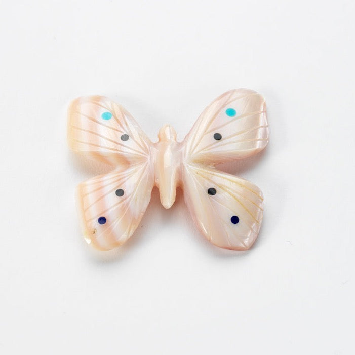 Tammy a well known artistic female of Zuni has quite the touch for her elegant butterflies the excellent use of shells inlayed with turquoise and lapis captures the essence of the butterfly.