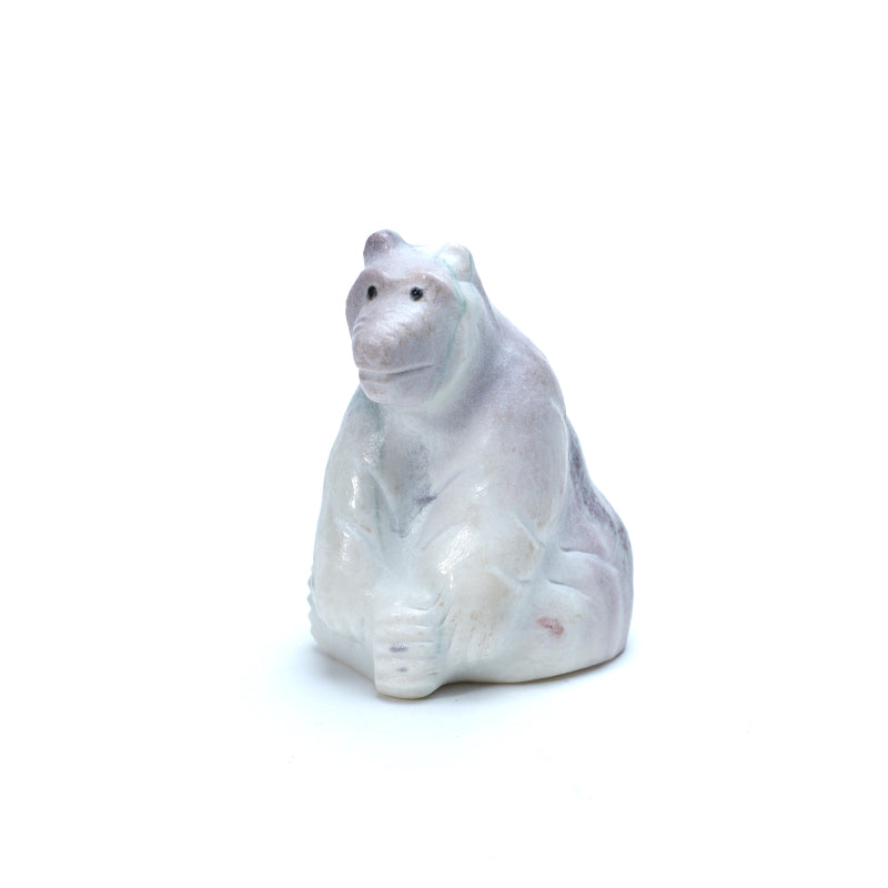 Terrance has shaped the bear in a calm, seated position, its rounded form emphasizing stability and presence. The white marble, veined with soft gray and purple tones, gives the carving a gentle, natural beauty—suggesting clouds drifting across a pale sky or light moving over stone. The bear’s black eyes add contrast and depth, giving it a grounded and thoughtful expression. They draw attention to the face, where quiet wisdom and endurance seem to reside. In Zuni tradition, the bear is a protector and healer, a guardian of strength, courage, and introspection. The white marble symbolizes purity and spiritual clarity, while the subtle purple hues may evoke intuition and connection to higher realms.