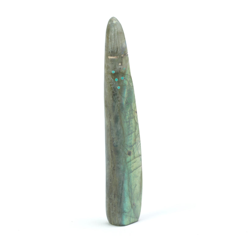 Usually the maiden fetish will be emerging from corn (the corn maiden) or she will have whorls of hair on the side of her head, signifying that she has not had a child. The mother fetish also can be emerging from the corn (the corn mother) and she will have children with her or look pregnant. The grandmother usually has a shawl over her head and no corn represented on her body.