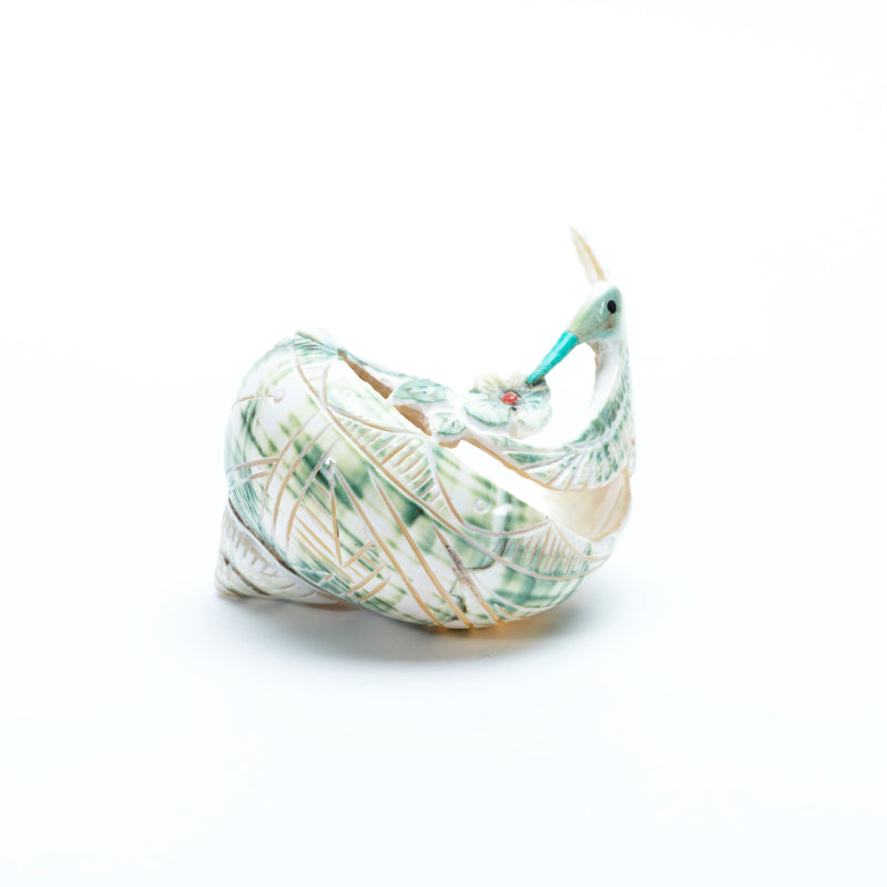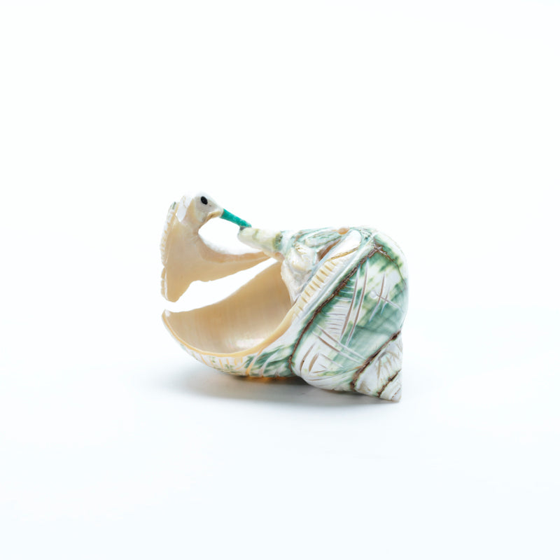 A hummingbird carved from a green snail shell comes to life in delicate detail, using the shell’s natural curves and spiral to shape the bird’s graceful body and wings. The shell’s soft green tones shimmer subtly, suggesting the iridescence of real feathers. Tiny black eyes give the hummingbird a lively, watchful expression, while a slender turquoise beak adds a vibrant touch of blue that contrasts beautifully with the shell’s natural hue. Ingeniously, the artist has incorporated a flower into the carving, seamlessly blending it into the form of the shell. At the flower’s center rests a small, inlaid coral dot—its rich red glow standing out vividly against the cooler tones of the piece. The combination of natural shell, colorful stone accents, and artistic ingenuity creates a carving that feels both delicate and full of life, as if the hummingbird has just hovered to sip from its flower.