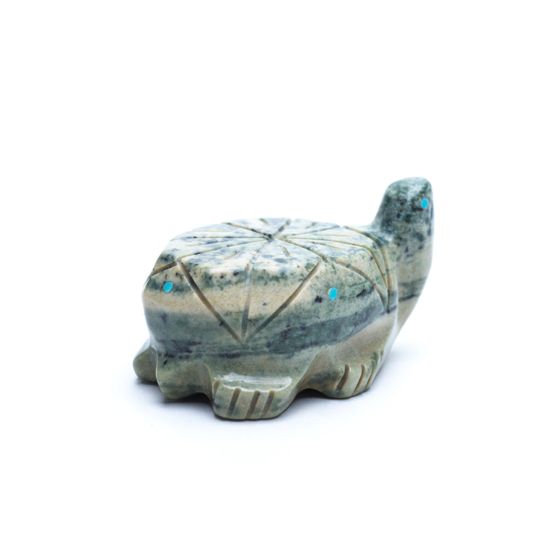 Turtle (Edo:wa): Turtle has always been esteemed because it carries its home on its back and goes with the flow of the river, not against it. In some mythologies, the first North Americans envisioned the continent as a turtle because it was surrounded by water. Turtle reminds us to respect Mother Earth.