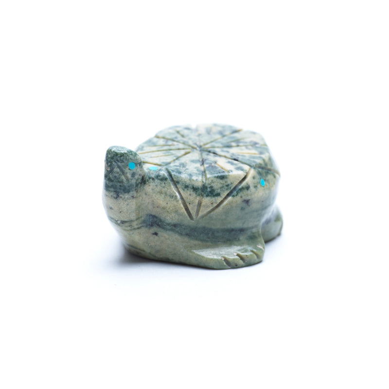 A turtle carved from serpentine is a beautiful embodiment of patience, protection, and deep earth energy. The stone, with its smooth texture and natural variations in hue—from soft mossy green to deeper forest tones—gives the carving a calming, organic presence. Subtle marbling or streaks within the stone may resemble ripples of water or leafy shadows, connecting the turtle to both land and stream.