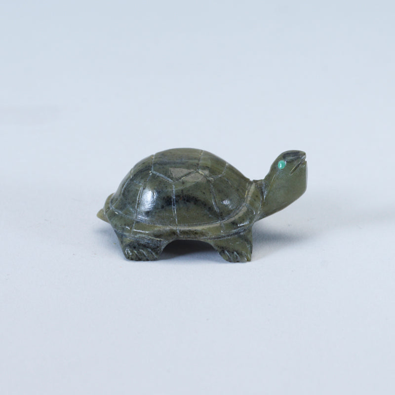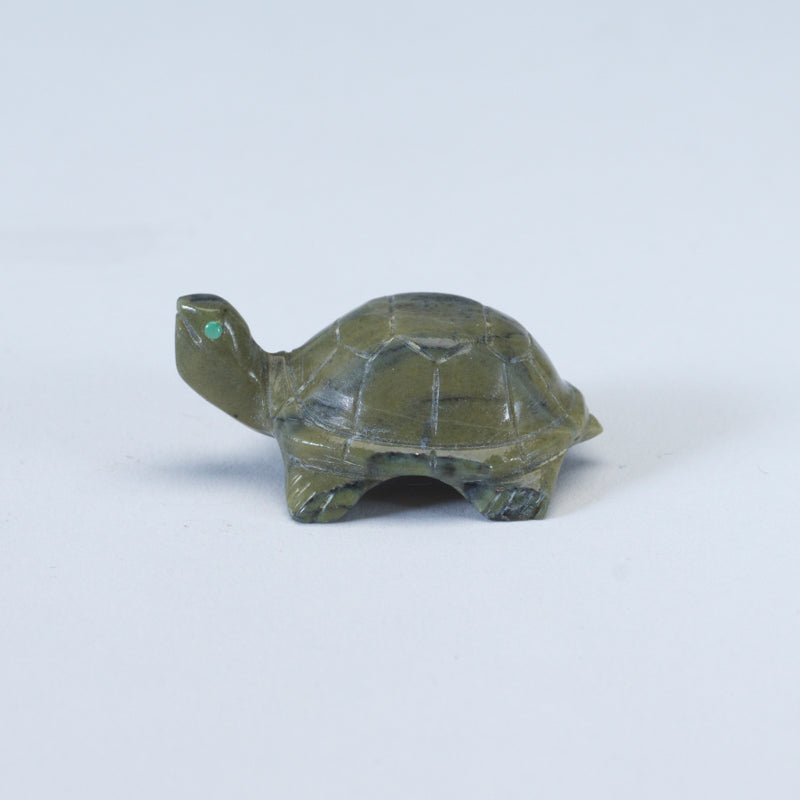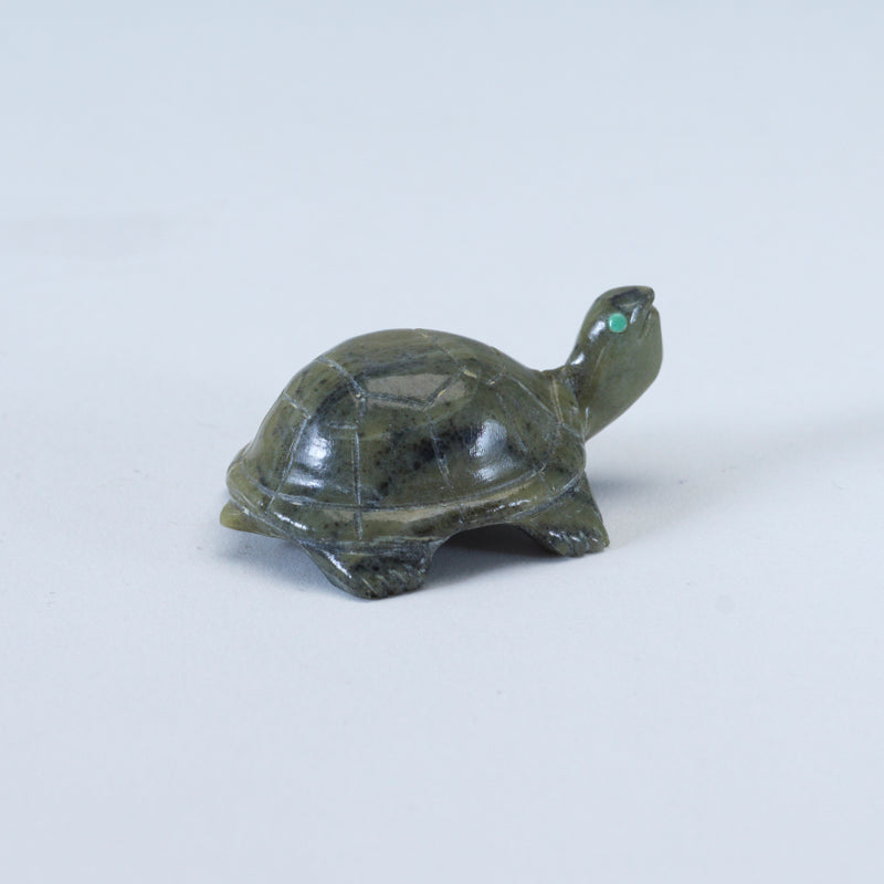 The serpentine stone embodies the nurturing spirit of Mother Earth, it assist the conscious direction of healing energies. The use of serpentine as the base material adds a beautiful green hue to the turtle's body, giving it an earthy and organic feel. The turquoise dotted inlay on the shell adds a pop of vibrant color, creating a striking contrast against the serpentine backdrop.