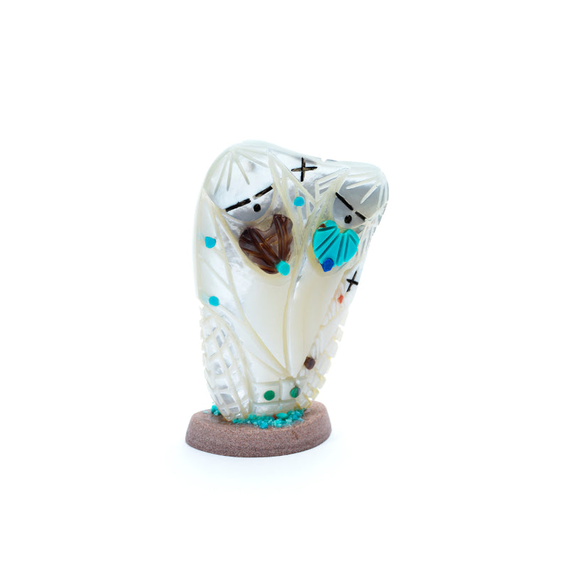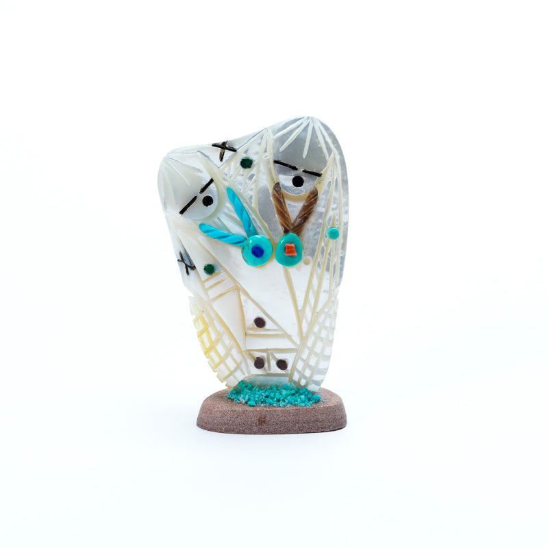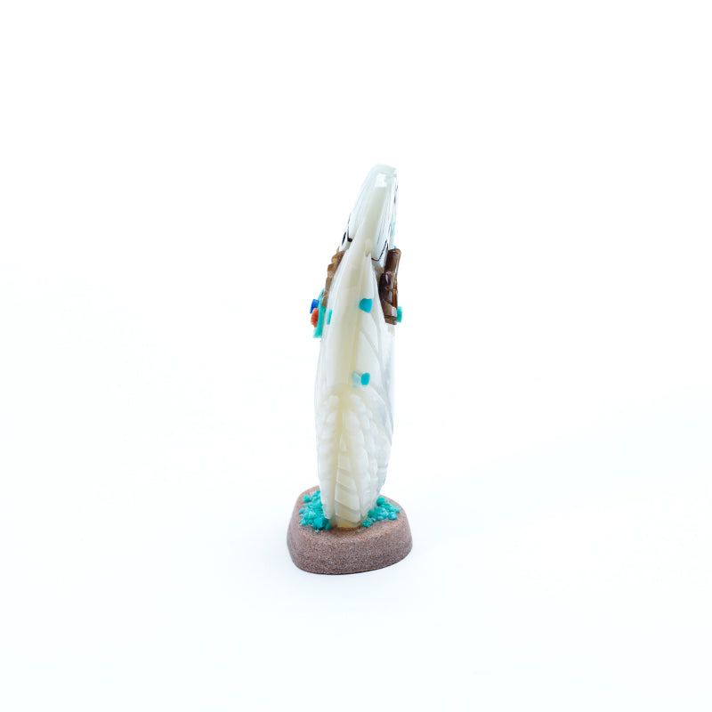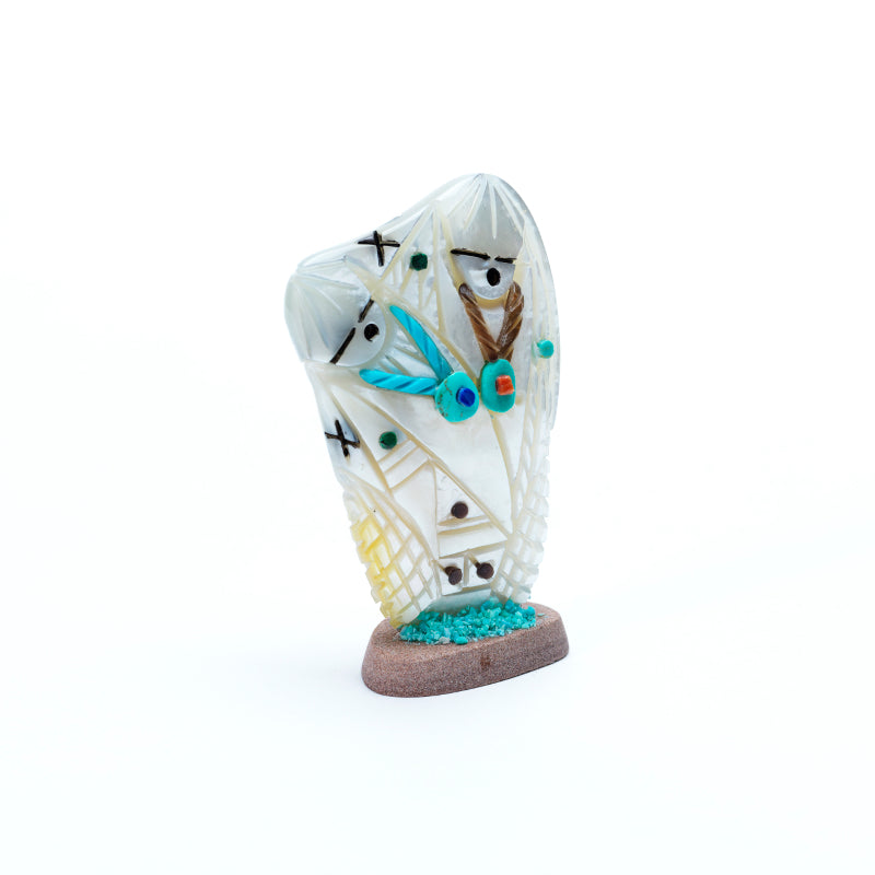 The mother of pearl’s surface shimmers with shifting hues—white, gold, blush, and pale green—changing with the light like ripples on calm water. The polished base anchors her presence, adding stability while allowing the iridescent figure to catch light from every angle. The combination of delicate carving and the pearl’s natural radiance gives the piece an ethereal, timeless quality, as though the maiden embodies elegance and serenity in physical form.