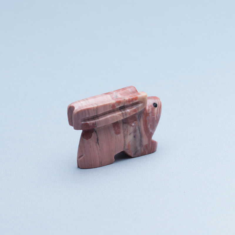 The smooth, swirling patterns in the dolomite bring an air of serenity to the piece, contrasting sharply with the intense gaze of the black eyes that seem to pierce through one's soul. And those teeth, crafted from shimmering mother of pearl, add an unsettling touch of opulence to this seemingly innocent creature. It is as if this rabbit is a specter from another world, caught between light and shadow, innocence and malevolence. Its presence demands attention and contemplation, challenging viewers to confront their own inner conflicts and contradictions within themselves. Truly, this rabbit is more than just a work of art - it is a powerful statement on the complexity of human nature itself.