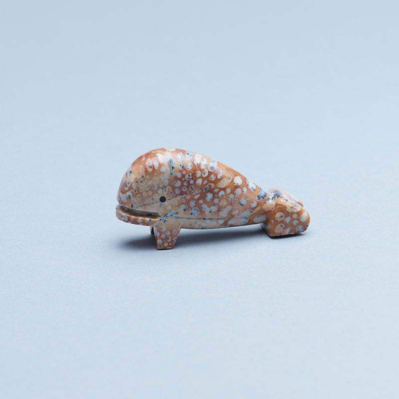 The rich colors of the tigilite stone evoke a sense of depth and majesty, while the black eyes convey a sense of mystery and intelligence. Each curve and line in the carving is meticulously crafted to capture the graceful movement and power of this majestic creature, making it appear almost alive. As light dances off the polished surface, it illuminates the natural patterns in the stone, giving the whale a dynamic presence that draws viewers in. This masterpiece serves as both a tribute to the beauty of marine life and a testament to the skill and creativity of its creator, Waldo.