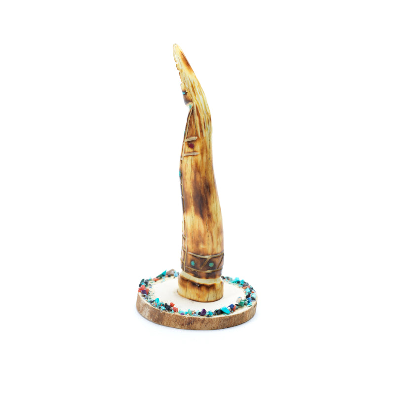 A maiden carved from antler stands with graceful poise, her elongated form smooth and finely detailed to highlight the natural creamy tones and subtle texture of the material. Her serene face is set with vivid turquoise eyes, their blue brilliance bringing life and spirit to her expression. Along her body, small inlaid turquoise dots add a decorative and symbolic touch, their vibrant color contrasting beautifully against the warm, organic surface of the antler. She is mounted on a polished wooden base, the rich grain and earthy tone of the wood grounding the figure and enhancing its natural elegance. The combination of antler, turquoise, and wood creates a piece that feels both timeless and deeply connected to the earth, blending artistry with cultural symbolism.